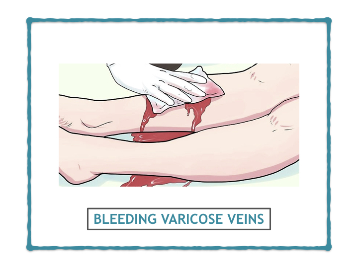 The thinned out or ulcerated skin may expose the dilated engorged veins, which in turn may bleed profusely even with trivial injury (hemorrhage).